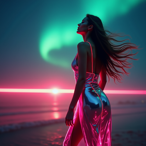 A woman in a shimmering dress stands on a beach, bathed in the ethereal glow of the aurora borealis. The vibrant colors of the sky reflect in her attire, creating a mystical and captivating scene.