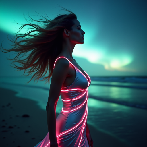 A woman, bathed in the ethereal glow of the aurora borealis, stands on a tranquil beach, her form outlined by vibrant neon lights.