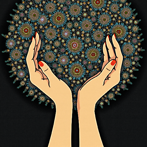 A pair of hands gently cradles a vibrant explosion of floral patterns, symbolizing growth and nurturing.