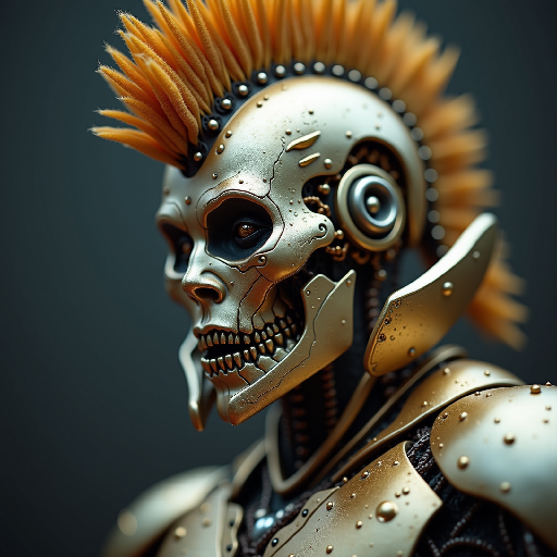 A golden mechanical skull with a punk mohawk, a fusion of futuristic and gothic styles.