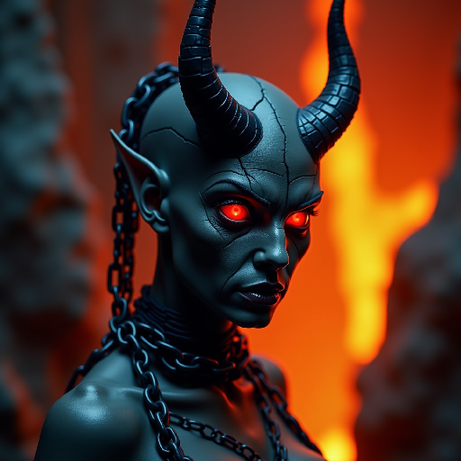 A powerful demon queen bound in chains, her crimson eyes burning with infernal fire.
