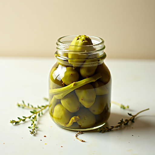 A close-up of plump green capers preserved in a glass jar, surrounded by fragrant thyme. This image captures the simple beauty of nature’s bounty, ready to add a burst of flavour.