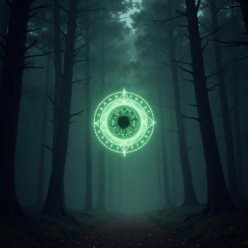 A luminous, intricate eye symbol floats mysteriously above a path winding through a dark, fog-laden forest, casting an ethereal green glow.