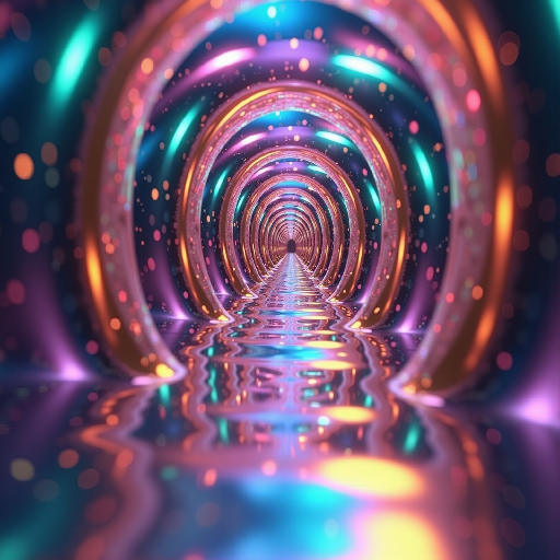 A journey through a glowing, endless tunnel of light, where vibrant colors and reflections create a mesmerizing and futuristic atmosphere.