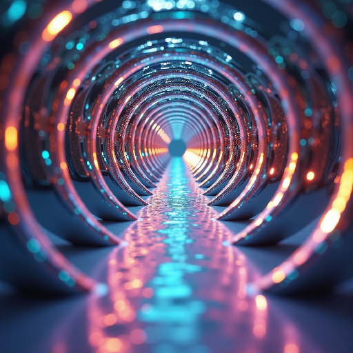 Step into an infinite tunnel of vibrant light, where neon hues reflect and dance in a mesmerizing digital echo.