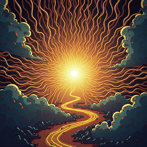 A vibrant and surreal landscape where a glowing path winds through dark clouds under a sky filled with a burst of golden energy radiating from a central light.