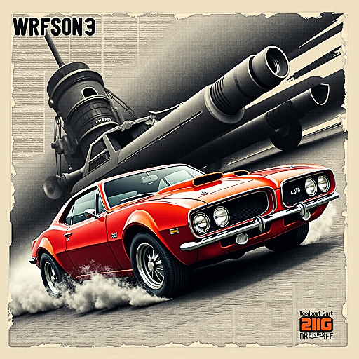 A vintage red car races alongside a futuristic vehicle in a retro-futuristic styled scene.