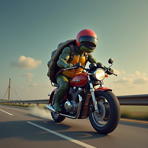A Teenage Mutant Ninja Turtle enjoys a thrilling motorcycle ride, showcasing his adventurous spirit and unexpected mode of transportation.