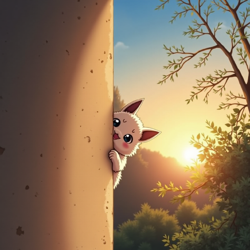 A curious little creature peeks from behind a pillar as the sun sets, casting a warm glow on the landscape.
