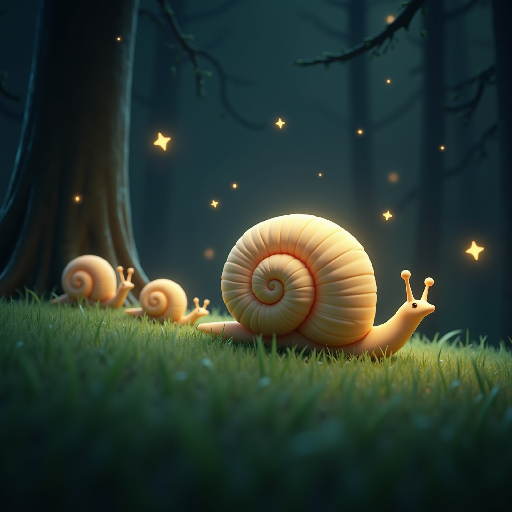 Three glowing snails embark on a nighttime journey through an enchanted forest, their shells illuminated by the soft light of fireflies.